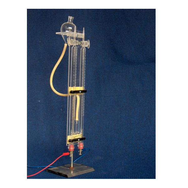 • Thiết bị điện phân nước (CSHH2067)- Đế bằng nhựa tròn Φ150mm, có gắn trục bằng thép Φ8mm; có công tắc bật/tắt nguồn pin 9V.- Ống nghiệm điện phân bằng thuỷ tinh trung tính hình chữ H có chia vạch nhỏ ...